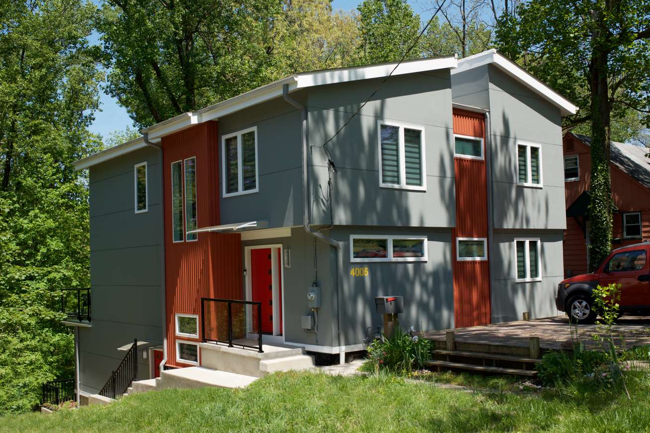 Per the owner’s request, the exterior walls are finished with fiber cement panels and brightly colored corrugated metal siding.
